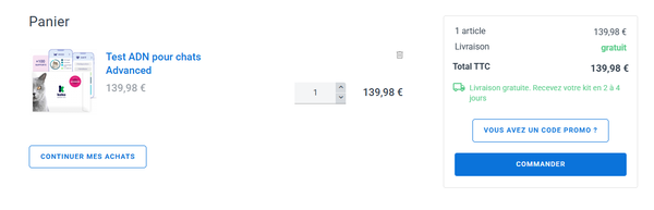 Questo kit per gatti offre le stesse caratteristiche di base della versione per cani. Il tuo felino beneficerà di un’analisi della sua razza, dei tratti fisici e del temperamento genetico. Il rapporto include informazioni sui possibili colori del mantello della sua prole e sulle predisposizioni comportamentali. È inclusa anche la funzione DNA Connect.