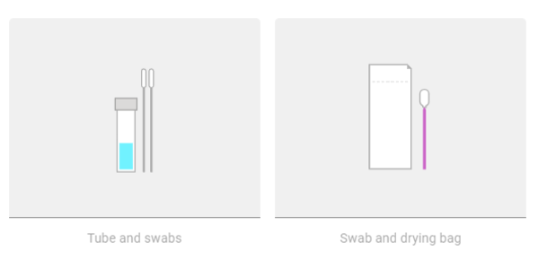 Per il kit con provetta, controlla che il liquido copra le estremità impregnate di saliva. Per il kit con sacchetto essiccante, inserisci la punta bianca nel sacchetto senza toccare altre superfici. Assicurati che rimanga nell’area designata per l’essiccazione.